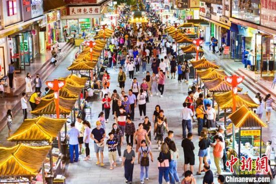 7月29日,游客在敦煌旅游工藝品一條街上漫步,體驗濃郁的民俗風情和敦煌文化?!⊥醣筱y 攝