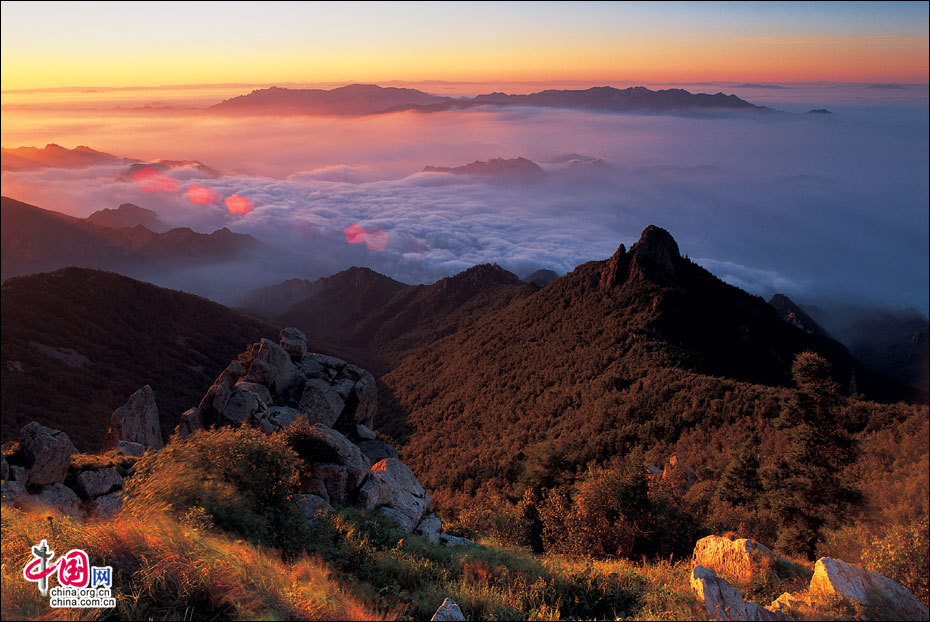 當北京的第一縷陽光從這里升起。站在海拔2118米的頂峰平臺上,遙望東方,天際中開始露出幾抹灰色的浮云,隨后不斷地升騰、擴大,繼而天邊漸紅,紅色越來越深,范圍越來越大,曙光漸露,丹霞輝映,把整個東方都變成濃濃的紅色。山峰在云霧中時隱時現(xiàn),彩云在天際間變幻,有時像奔馳的駿馬,有時像仙女飄逸,有時像玉樹瓊宮……千姿百態(tài),遐想無窮。猛然,比紅色的彩云更火紅、更光亮、更鮮艷的太陽露出了一條邊弧,緩緩上升。四周的云霧似乎忍受不了她那光茫的照射而淡化、隱退,太陽則很快掙脫了云霧與夜色的纏繞,迅速地上升,躍出天邊。霎時,一輪紅日噴薄而出,金光四射,霞光瑞氣,照徹天宇,山巒、萬樹沐浴著朝陽的金輝,令人眼花繚亂。舉目四望,朝霞映照下的霧靈山,群峰起伏,云霧如海,波濤洶涌,九曲十八彎的旅游公路似戲水游龍,在峰巒間若隱若現(xiàn)。