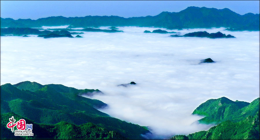 暖濕空氣上升到一定高度,遇冷凝結成云霧,形成霧靈山變幻莫測、波瀾壯闊的霧靈云海。云海在無風之際是出奇的平靜,輕風吹過,濺起層層浪花。風勢稍強,便似波濤洶涌,又如萬馬奔騰,置身山巔,神思飛越,浮想聯(lián)翩,仿佛進入夢幻世界。站在頂峰遠眺,山巒在云海中出沒無常,宛若大海中的無數(shù)島嶼,時隱時現(xiàn),似真似幻,使人感到一種神奇縹緲的仙境般的美。云海中的景物若隱若現(xiàn),虛虛實實,令觀者捉摸不定,于是產生幽邃、神秘、玄妙之感,給人一種朦朧的美。從美學角度觀察,霧靈云海妙在似海非海,非海似海。其潔白云霧的飄蕩,使霧靈山呈現(xiàn)出靜中寓動的美感。正是在這種動靜結合之中,造化出變幻莫測,氣象萬千的人間仙境。