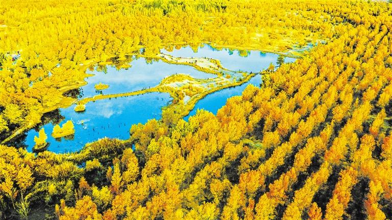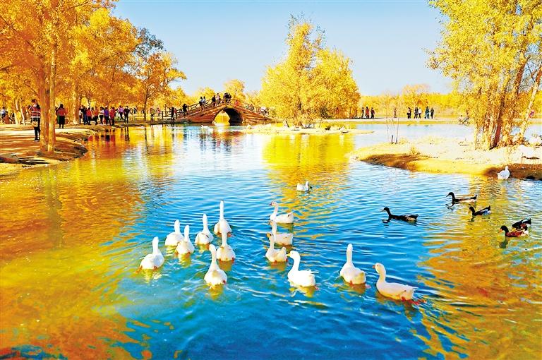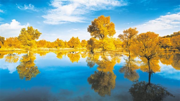 站在金波湖邊,滿目的赤橙黃綠與盈盈秋水互相映襯,胡楊金色的葉子倒映在潭水中,形成金色的水泊,微風(fēng)掠過,層層漣漪漸漸擴大,最后消失在胡楊的倩影里,構(gòu)成一幅幅精美的油畫。烘托出一幅“碧云天、黃葉地、秋色連波、波上寒煙翠”的絕美妙油畫卷。