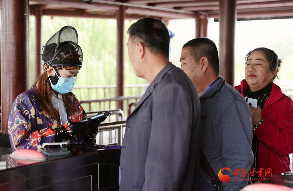 9月22日,記者在嘉峪關(guān)關(guān)城看到前來(lái)參觀的游客絡(luò)繹不絕,大家跟隨漢服飄逸的講解員沿著關(guān)城前行。在甕城感受“甕中捉鱉”的境遇,在關(guān)口倒換通關(guān)文牒尋求關(guān)照。一路上都能遇到穿著明朝服飾的工作人員,將人們帶入大明風(fēng)華的場(chǎng)景之中。