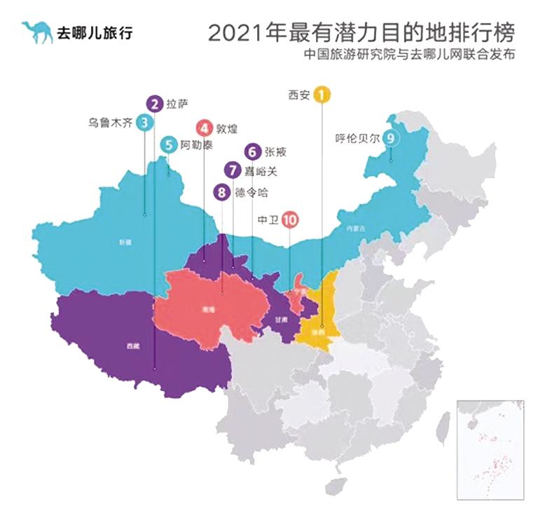 中國旅游研究院與去哪兒網(wǎng)課題組根據(jù)旅游目的地2020年和2019年的預(yù)訂增量、平均價(jià)格、出行時(shí)間和搜索熱度,發(fā)布2021年最有潛力目的地排行榜和2021年小眾旅游目的地排行榜。其中前十位的目的地包含我省敦煌、張掖、嘉峪關(guān)三座絲路名城,今年西北地區(qū)將在2021年吸引更多游客前往。