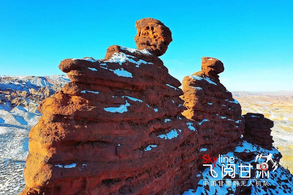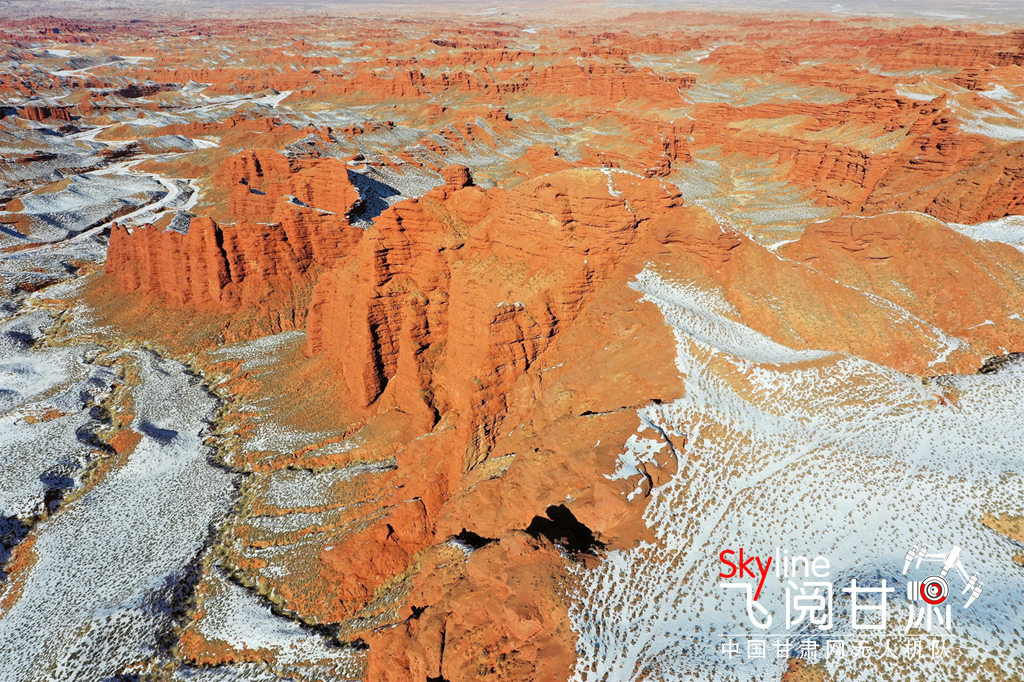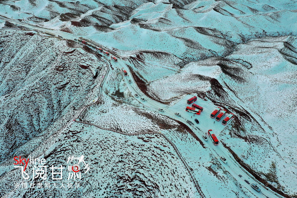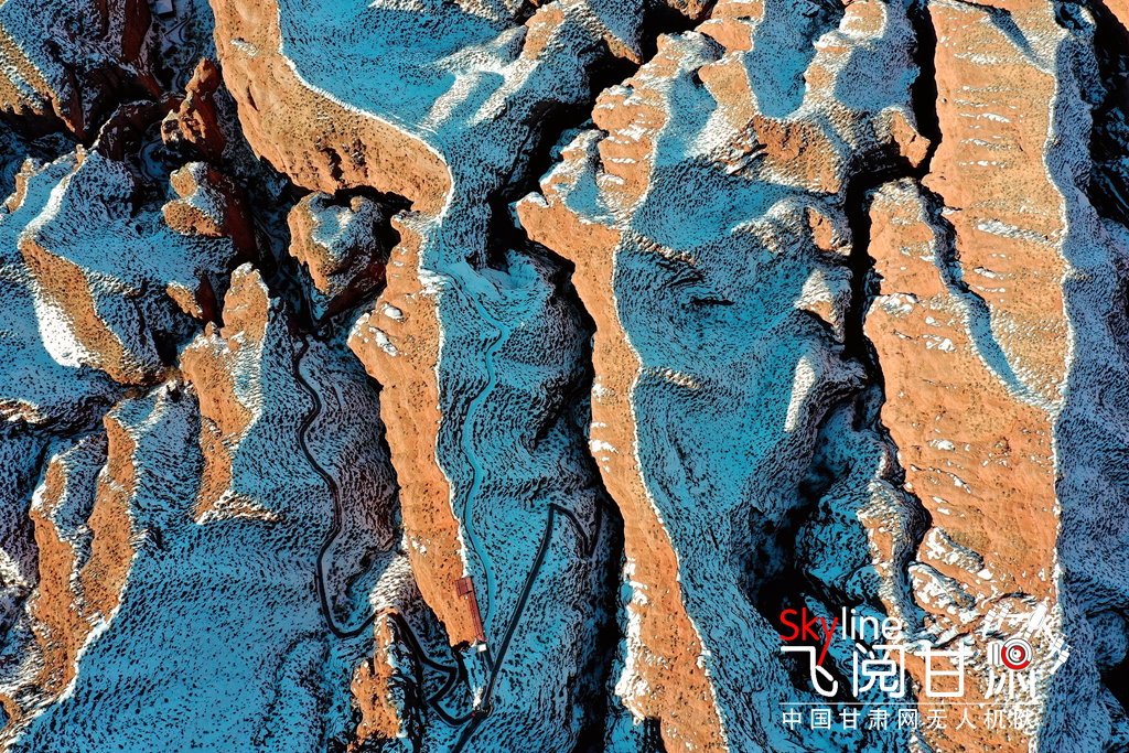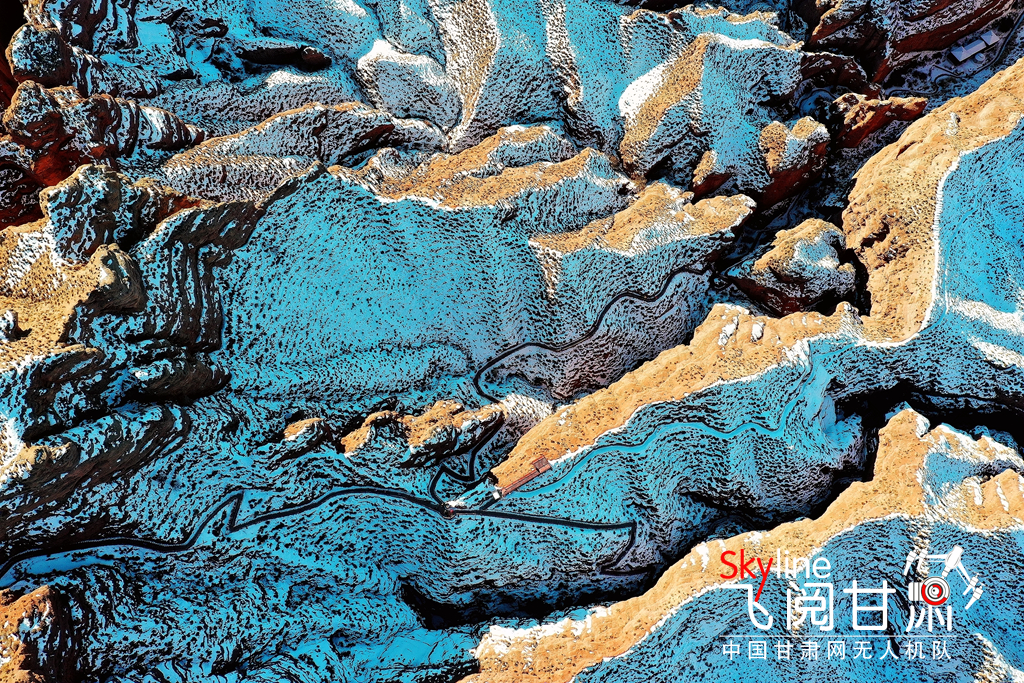 12月26日,俯瞰大雪覆蓋的甘肅省張掖平山湖大峽谷景區(qū),銀裝素裹中顯露出褐色丹霞,宛如一幅美麗畫卷,吸引眾多的游客踏雪賞景。(無人機照片)