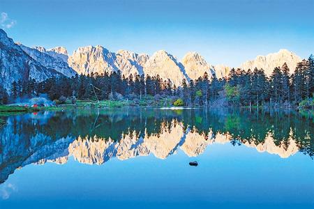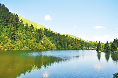 達(dá)爾宗湖四周松柏參天,灌木叢生,湖邊延伸著翠綠如毯的青草地。整個湖面呈不規(guī)則的葫蘆形,湖水深不可測。它時而碧波蕩漾,時而平靜如鏡,宛如嫻靜溫柔的少女。