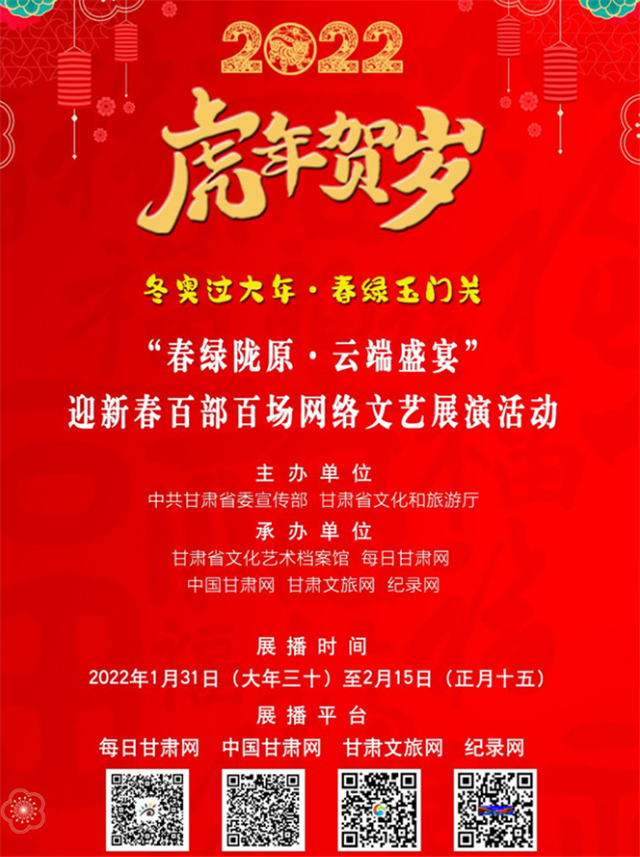 甘肅省博物館在春節(jié)期間舉辦了“虎虎生福——壬寅(虎年)新春生肖文物聯(lián)展”,甘肅省圖書(shū)館舉辦7大專(zhuān)題30余項(xiàng)文化體驗(yàn)活動(dòng)。在“春之華章”2022年甘肅省電視春節(jié)聯(lián)歡晚會(huì)上,原創(chuàng)話劇《八步沙》、隴劇《大禹治水》等精彩上演;甘肅省非遺保護(hù)中心開(kāi)展了“虎虎有神過(guò)大年——如意甘肅·多彩非遺”宣傳推廣活動(dòng);甘肅演藝集團(tuán)通過(guò)線上線下結(jié)合方式,開(kāi)展2022“我們的中國(guó)夢(mèng)”——文化進(jìn)萬(wàn)家迎新春文藝演出活動(dòng);張掖市舉辦春節(jié)“九曲黃河燈陣啟燈納福非遺文化展演”活動(dòng)。