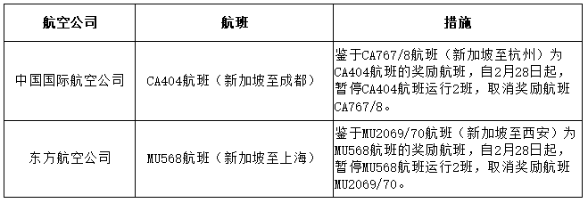 根據民航局通報,2月9日入境的中國國際航空公司CA404航班(新加坡至成都)確診新冠肺炎旅客5例,鑒于CA767/8航班(新加坡至杭州)為CA404航班的獎勵航班,自2月28日起,暫停CA404航班運行2班,取消獎勵航班CA767/8。2月10日入境的東方航空公司MU568航班(新加坡至上海)確診新冠肺炎旅客5例,鑒于MU2069/70航班(新加坡至西安)為MU568航班的獎勵航班,自2月28日起,暫停MU568航班運行2班,取消獎勵航班MU2069/70。上述熔斷的航班量不得用于其它航線。