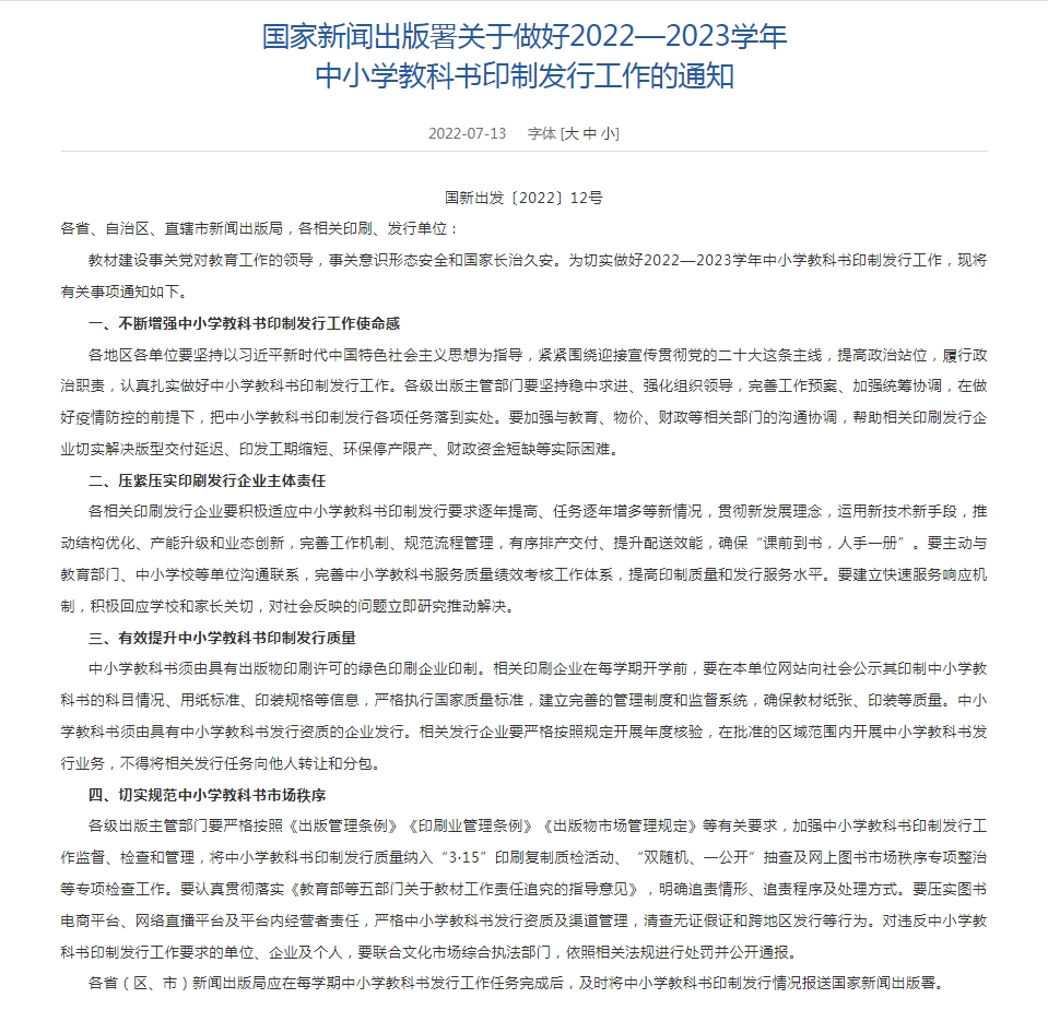13日,國家新聞出版署網(wǎng)站發(fā)布《國家新聞出版署關(guān)于做好2022—2023學年中小學教科書印制發(fā)行工作的通知》(以下簡稱《通知》)。其中強調(diào),各相關(guān)印刷發(fā)行企業(yè)要積極適應中小學教科書印制發(fā)行要求逐年提高、任務逐年增多等新情況?!锻ㄖ返淖詈蟊硎?,要切實規(guī)范中小學教科書市場秩序。
