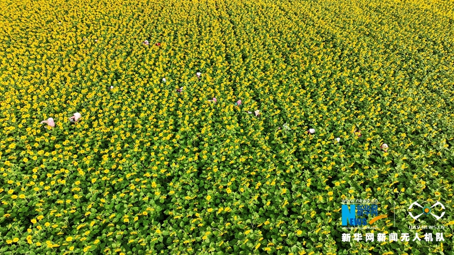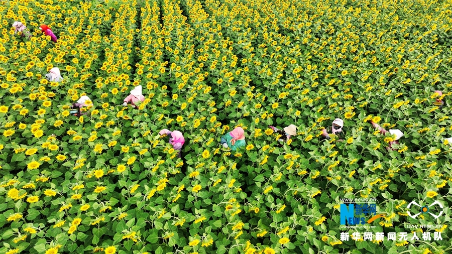 7月23日,甘肅省張掖市臨澤縣新華鎮(zhèn)長莊村近千畝制種向日葵盛開,金色花海里數(shù)十名葵農忙著為向日葵授粉。新華網發(fā)(成林 攝)