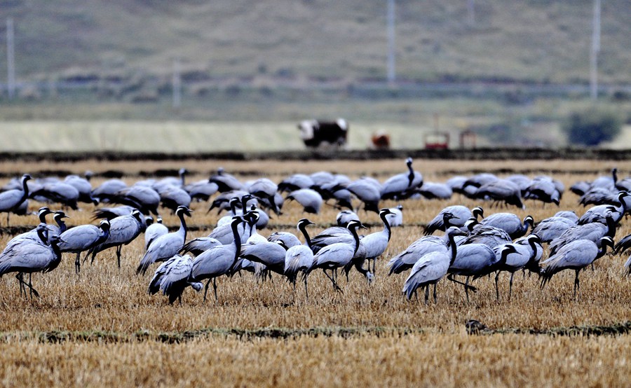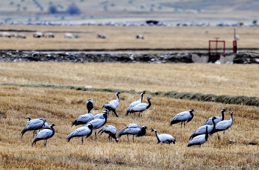 人民網(wǎng)蘭州10月10日電 (記者高翔)寒露至、候鳥遷,甘肅省肅南裕固族自治縣皇城鎮(zhèn)夏日塔拉草原迎來(lái)數(shù)千只蓑羽鶴,它們?cè)跐竦氐乃嫔稀⒉輩仓谢蛴崎e覓食、或蹁躚起舞,與色彩斑斕的草原構(gòu)成了一幅和諧優(yōu)美的生態(tài)畫卷。