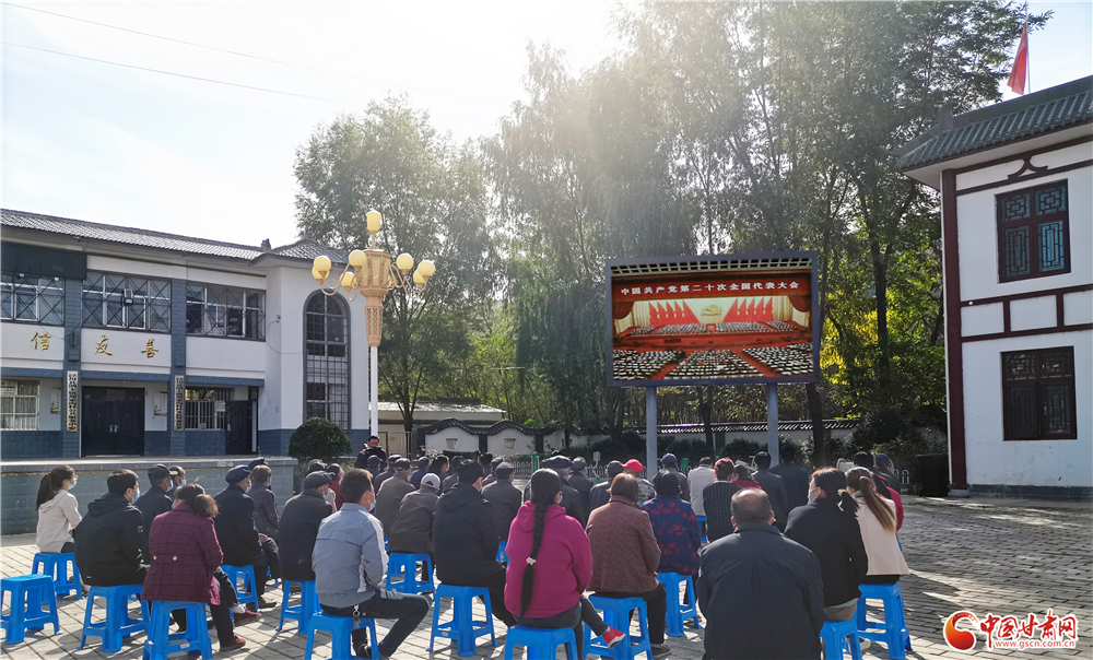 平?jīng)鍪袥艽h汭豐鎮(zhèn)鄭家溝村干部群眾早早來到村公共服務(wù)中心廣場,通過大屏幕收看大會開幕盛況。