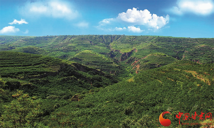站在田家溝梁峁山巔望去,一路向北沿著蜿蜒的山道,一幅偌大的山水畫呈現(xiàn)在眼前。藍(lán)天白云下,青山綠水、林苑疊嶂。