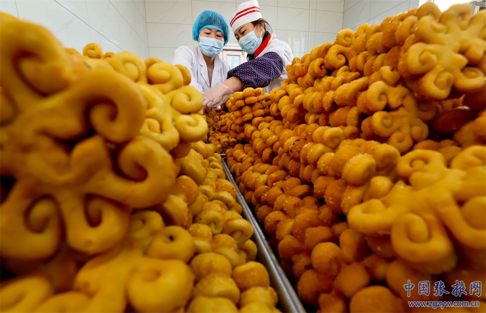 1月10日,張掖市山丹縣隴圓食品加工坊饃饃制作車間里,工作人員正在緊張忙碌著將制作好的“糖花子”放入冷卻盤中。