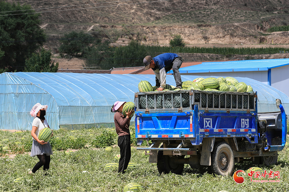 7月31日,甘肅省白銀市會(huì)寧縣土高山鄉(xiāng)種植的砂田西瓜喜獲豐收,瓜農(nóng)們忙著采收、搬運(yùn)、裝車外運(yùn),“搶鮮”上市銷售。