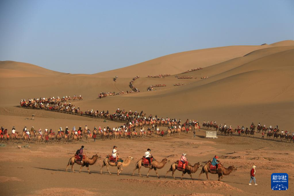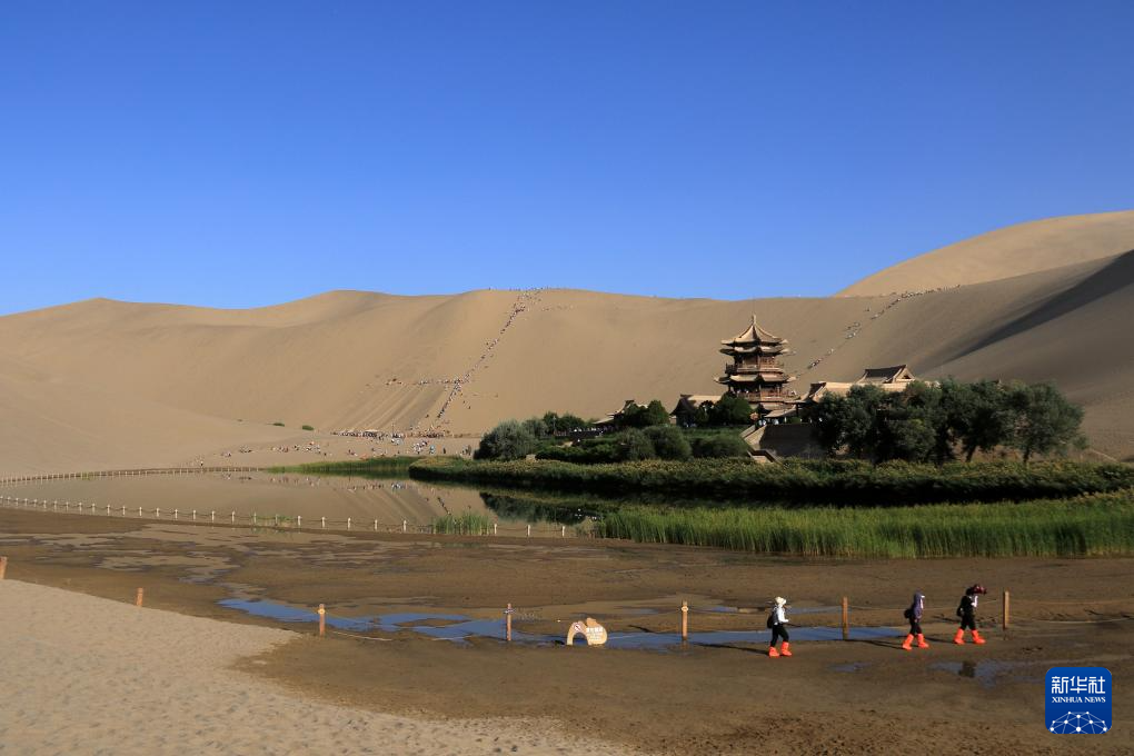 初秋時(shí)節(jié),甘肅省敦煌市碧空如洗,鳴沙山月牙泉景區(qū)景色如畫(huà),引人入勝。