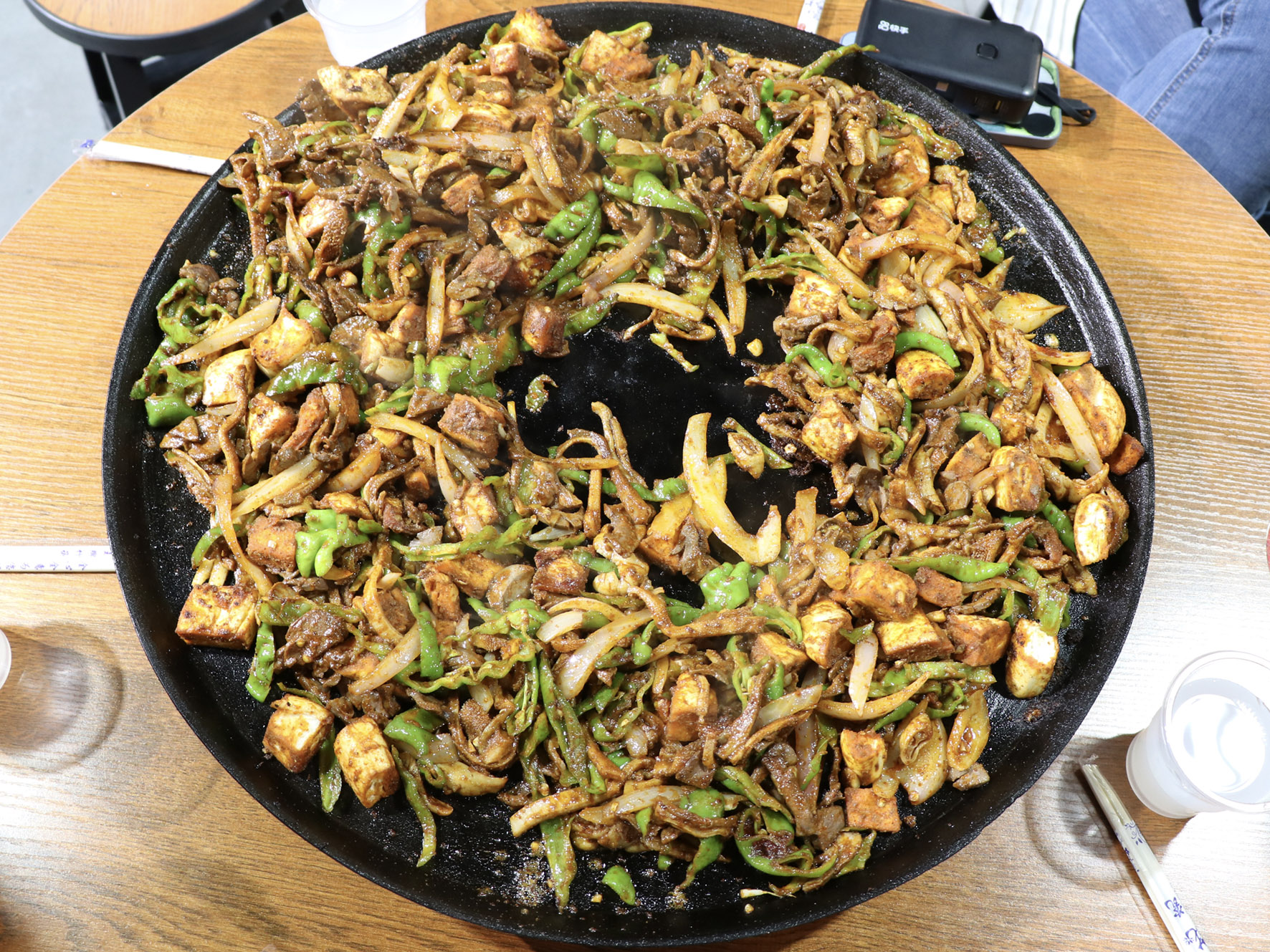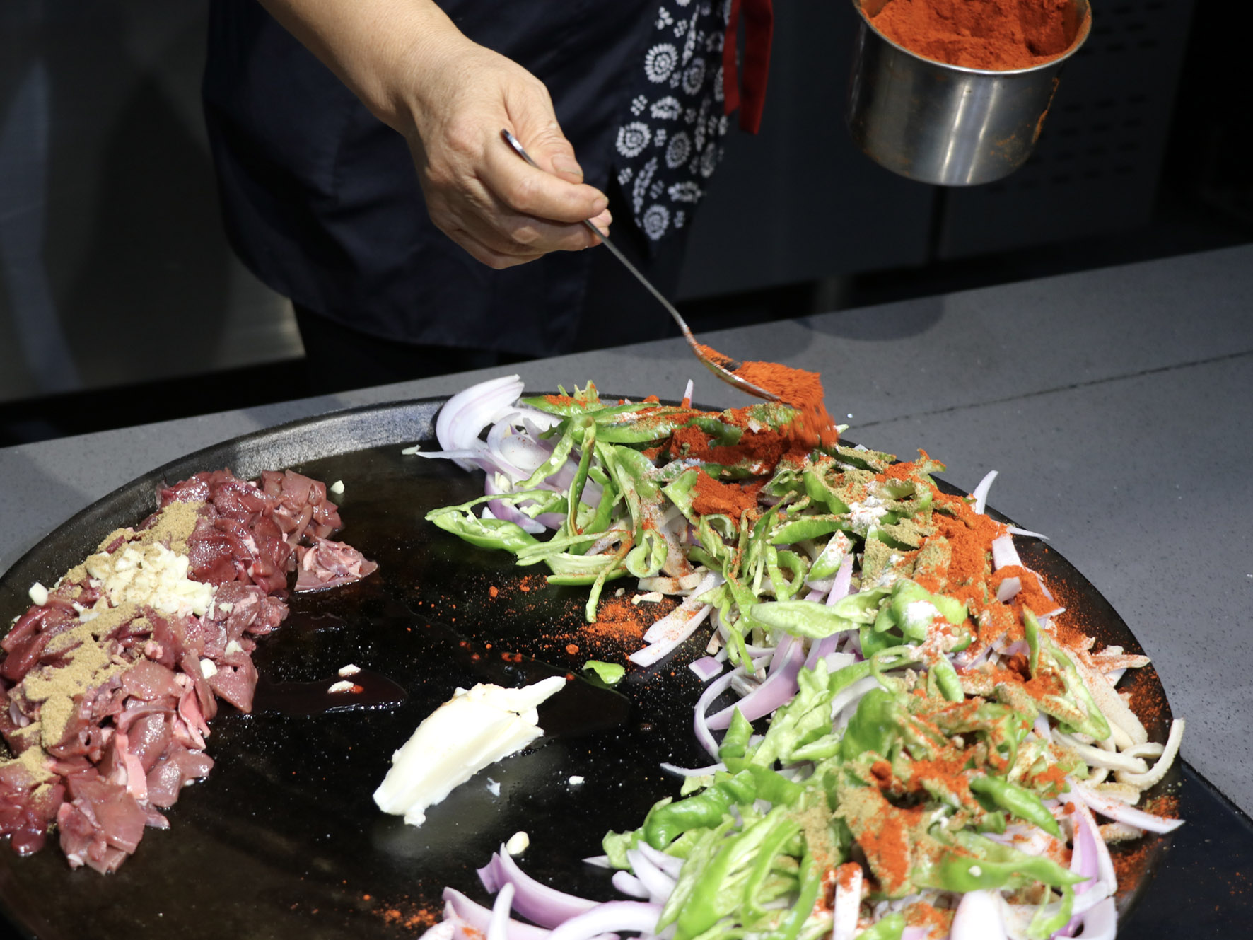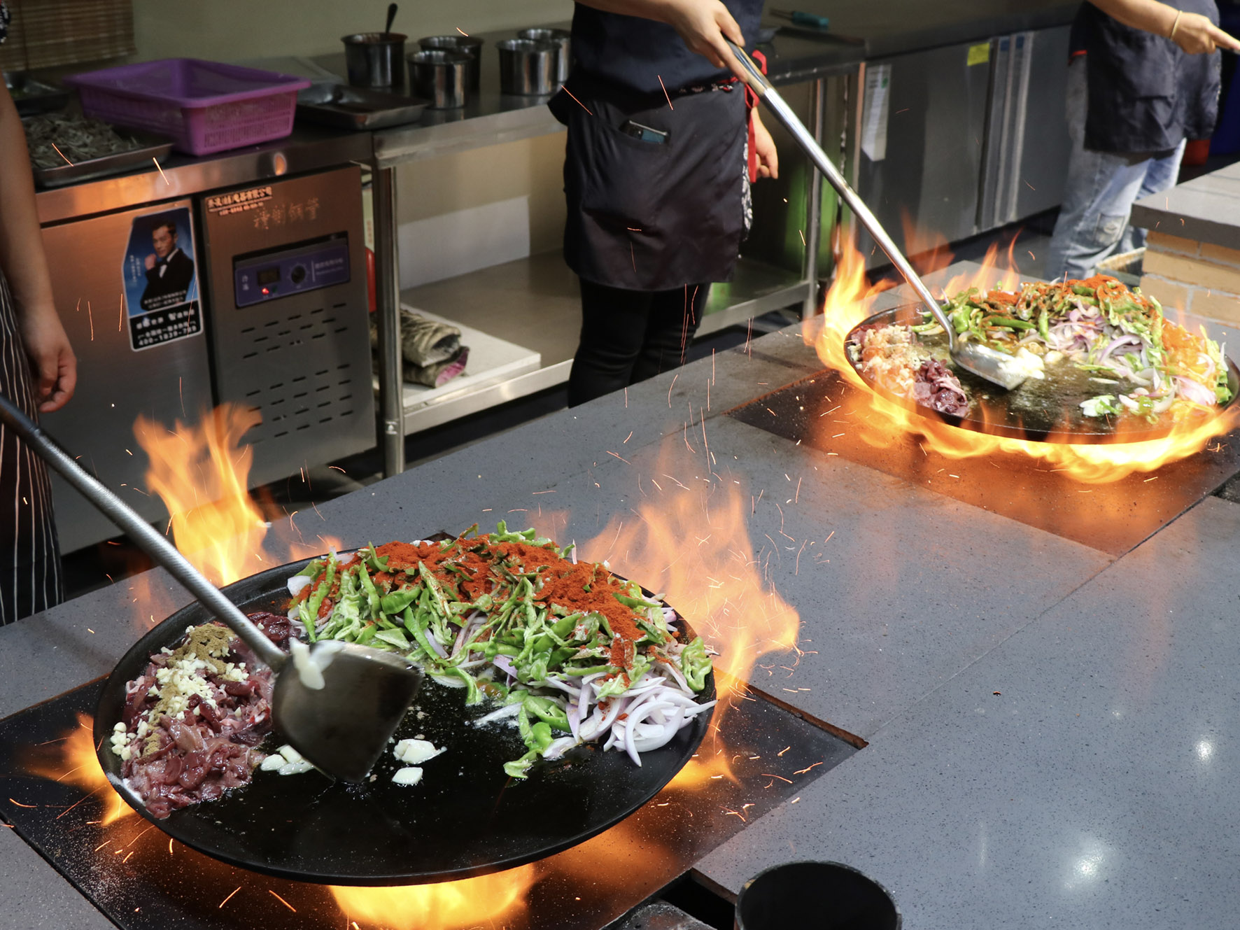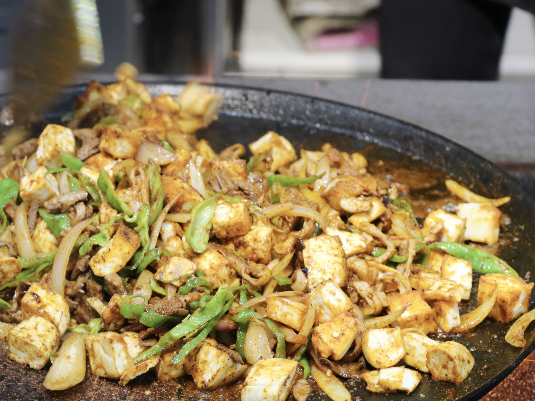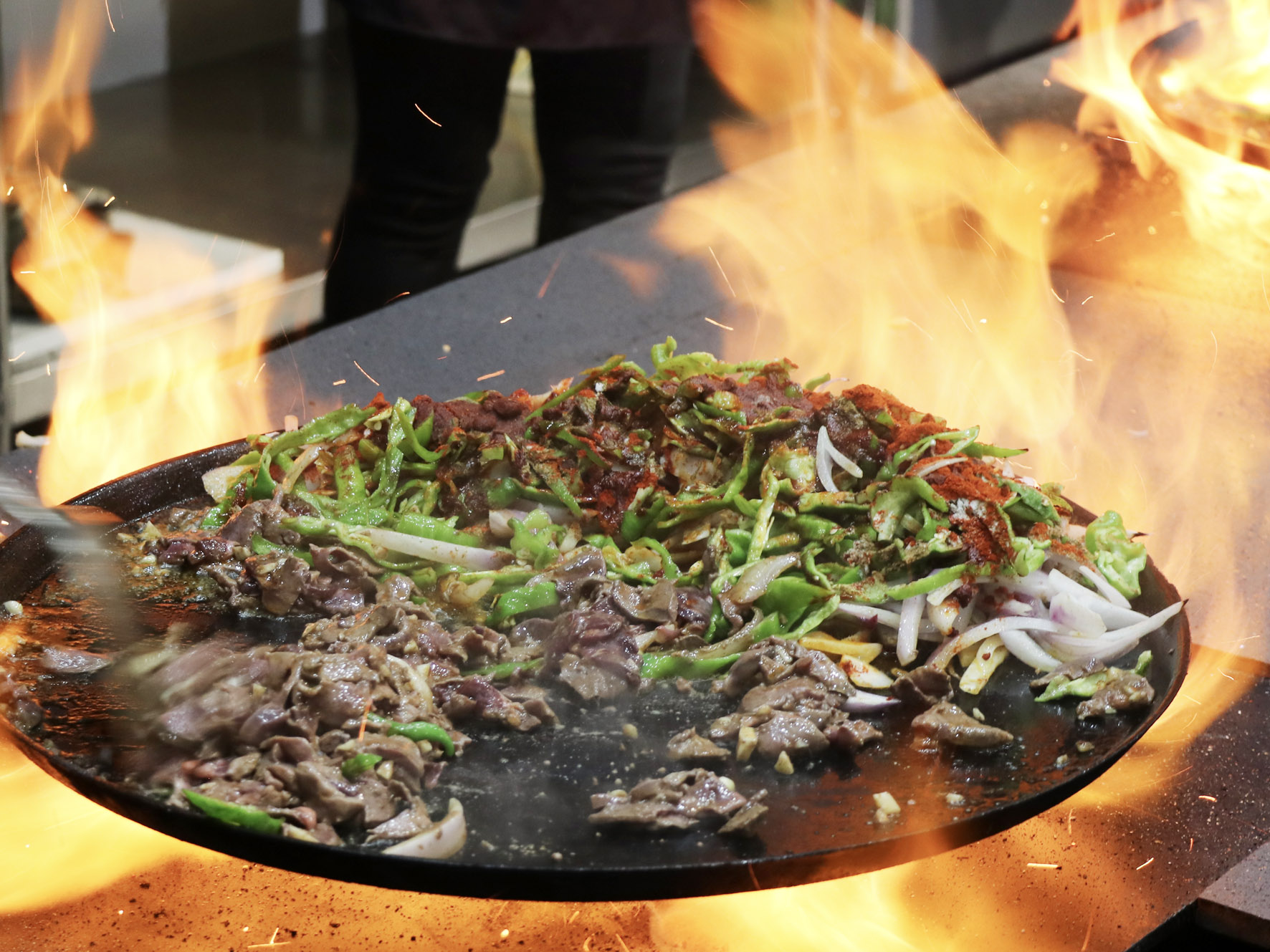 最美味的食物往往來自于最樸素的食材,只見店家將切好的羊肝、肺、肚、腸、心等佐以洋蔥、青椒下入一個(gè)鑄鐵鏊子里,再加上幾勺鹽和辣椒面,開始用猛火爆炒,火星四濺,一頓撥拉之后,待到七分熟左右再放入提前準(zhǔn)備好的白餅塊一起翻炒即可。