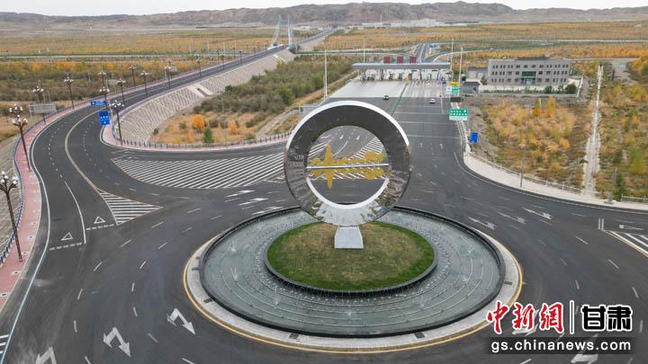 圖為位于金塔南收費站入口前,帶有胡楊和古佛塔元素的“天空之鏡”建筑。(無人機照片) 九美旦增 攝