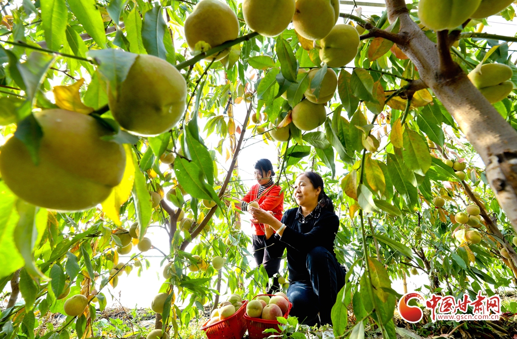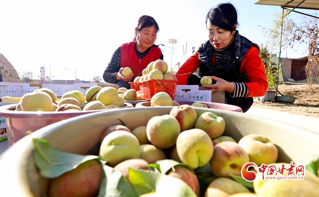11月13日,甘肅省張掖市甘州區(qū)長(zhǎng)安鎮(zhèn)一果蔬種植專業(yè)合作社“甘泉雪桃”種植基地大棚內(nèi),種植農(nóng)戶正在采摘成熟的“甘泉雪桃”。