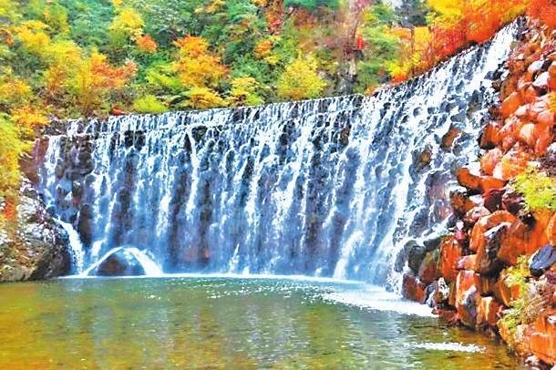 又一潭水,繼續(xù)沿峽谷流淌,峭壁處,一樹紅葉,恰到好處,映襯一掛瀑布,踩在石塊上,搖搖晃晃,涉水而過,撩水戲耍,或掬水飲,甘甜,透心涼,肺腑舒暢。