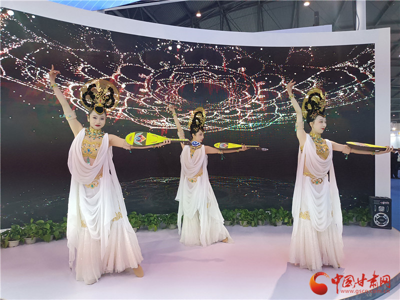 走進(jìn)甘肅特色版權(quán)館,敦煌文化元素濃郁。無論是展廳頂部的三兔共耳藻井,還是數(shù)字敦煌展區(qū)顯眼現(xiàn)代的四個大字,都在展示甘肅的敦煌元素。而展廳舞臺區(qū)更是以數(shù)字敦煌庫為背景,由舞蹈演員現(xiàn)場表演《妙音反彈》,讓觀眾走進(jìn)甘肅館,就能發(fā)現(xiàn)敦煌韻。