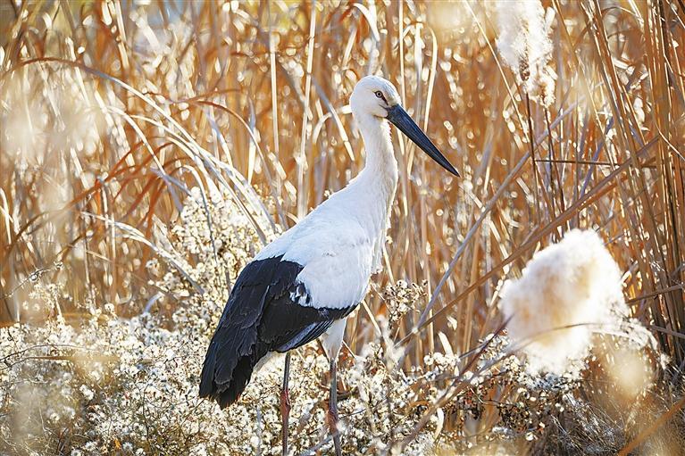 東方白鸛是一種大型涉禽,為鸛形目鸛科鳥(niǎo)類(lèi)。其體態(tài)優(yōu)美,成鳥(niǎo)體長(zhǎng)超過(guò)1米,黑翅白體,赤腳長(zhǎng)喙,棲息于開(kāi)闊的沼澤、湖泊和潮濕草地。東方白鸛是少見(jiàn)的旅鳥(niǎo),因繁殖分布區(qū)域狹窄,野生種群數(shù)量極為稀少,在《世界自然保護(hù)聯(lián)盟瀕危物種紅色名錄》中屬于瀕危等級(jí),是我國(guó)一級(jí)重點(diǎn)保護(hù)野生動(dòng)物,有“鳥(niǎo)界國(guó)寶”“鳥(niǎo)類(lèi)大熊貓”之稱(chēng)。