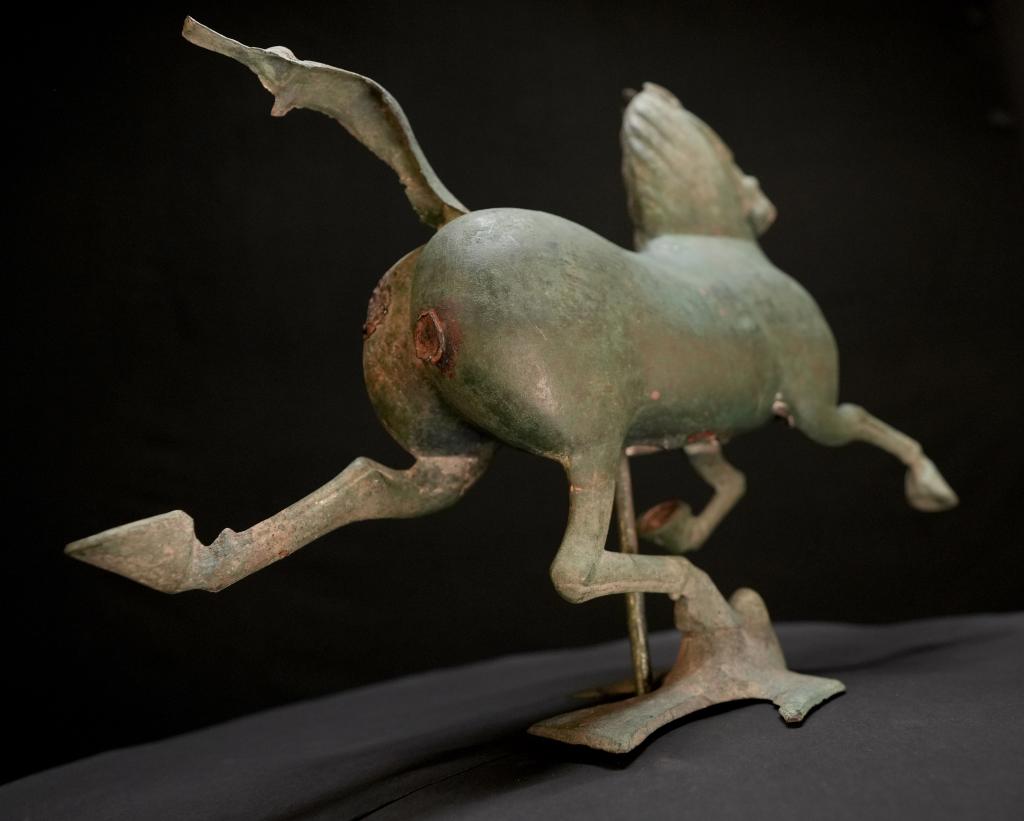 銅奔馬馬身著力點集中于超躡飛鳥的一足之上,既表現(xiàn)了奔馬騰躍于飛鳥之上時風(fēng)馳電掣般的速度,又巧妙地利用飛鳥的軀體以及展開的雙翅,擴大了著地面積,穩(wěn)定了重心,其造型完全符合現(xiàn)代力學(xué)的平衡原理。