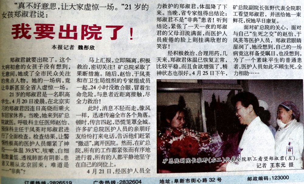作為部門領導,她依然表現出色,2003年“非典”期間,她擔任阜新晚報要聞部主任,她提出“最危險的地方,我先上!”4月20日,有一個學生從北京回來,因為高燒不退被懷疑為感染“非典”,一時間謠言四起,恐慌籠罩全城,魏彤欣一個人冒著風險深入醫(yī)院跟蹤采訪,在得知確診不是“非典”后,第一時間發(fā)出了報道《我要出院了》,及時消除了公眾恐慌情緒。她帶領記者深入發(fā)熱門診、城市出入口的檢查站和醫(yī)護人員之間,掌握了大量的一手材料,共采寫了70余篇稿件,她本人被評為“遼寧省抗擊非典新聞宣傳先進個人”,她所在的部門被評為“遼寧省抗擊非典新聞宣傳先進集體”。