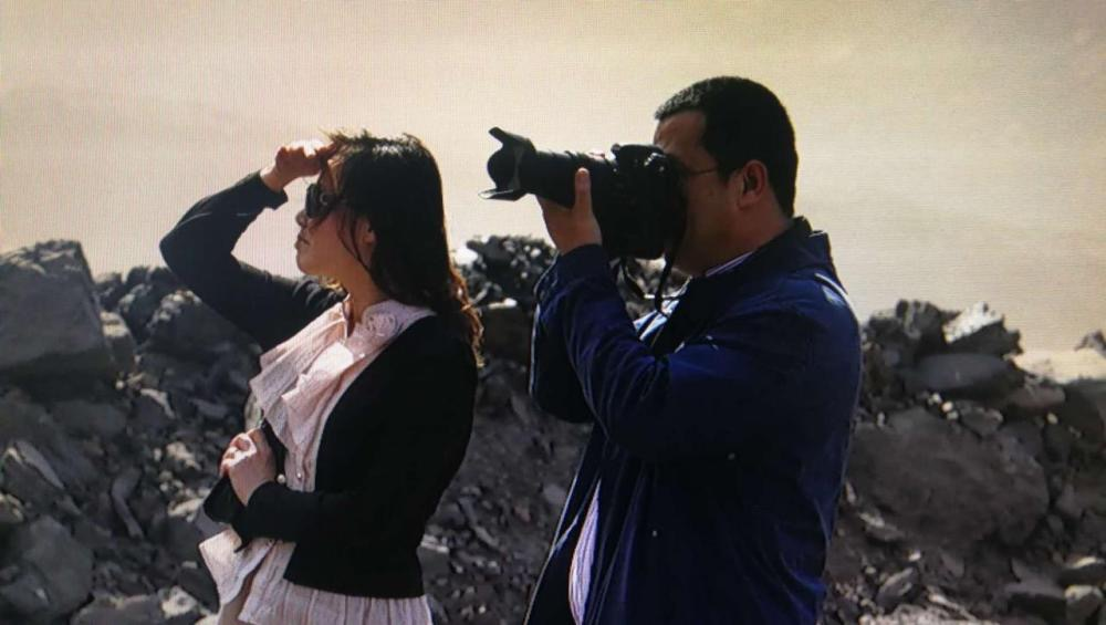 魏彤欣(左一)深入海州露天煤礦礦坑中采訪。阜新市傳媒中心供圖