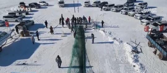 在克什克騰旗達(dá)里湖現(xiàn)場(chǎng),人工鑿冰、冰下走網(wǎng),冬捕隊(duì)員在作業(yè)時(shí)選用5公分網(wǎng)眼,這樣捕魚(yú)時(shí)就能漏掉小魚(yú)。馬拉絞盤(pán)將大網(wǎng)拖拽出網(wǎng)口,滿載魚(yú)兒的漁網(wǎng)慢慢地從湖水中出來(lái),游客們感受豐收的喜悅。