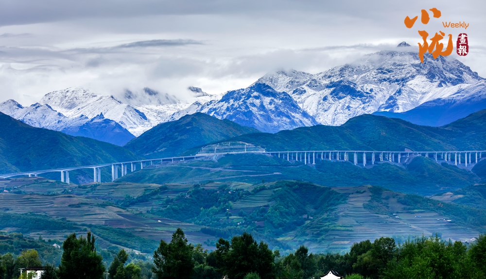 層巒疊嶂的雪峰和蔥郁的山坡、綠樹(shù)形成鮮明對(duì)比,成為一道靚麗的風(fēng)景線(xiàn)。駐足遠(yuǎn)觀,滿(mǎn)眼都是大自然的溫柔與浪漫。