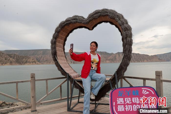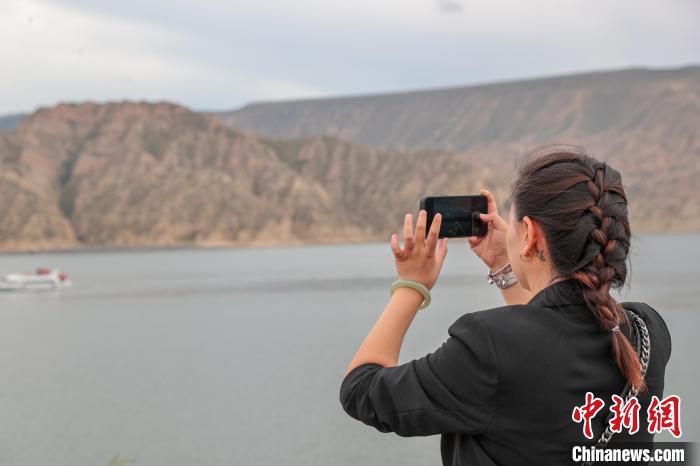 圖為游客在龍羊峽景區(qū)內(nèi)自拍留念。中新社記者 薛蒂 攝