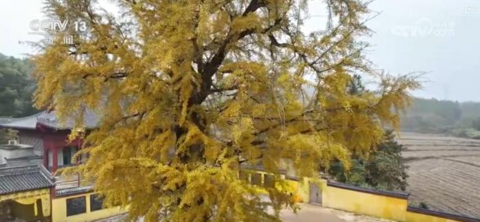 在江西撫州臨川區(qū),一株千年銀杏樹迎來了最佳觀賞期。一片片黃色的銀杏葉猶如一串串金色風鈴,掛滿樹梢。