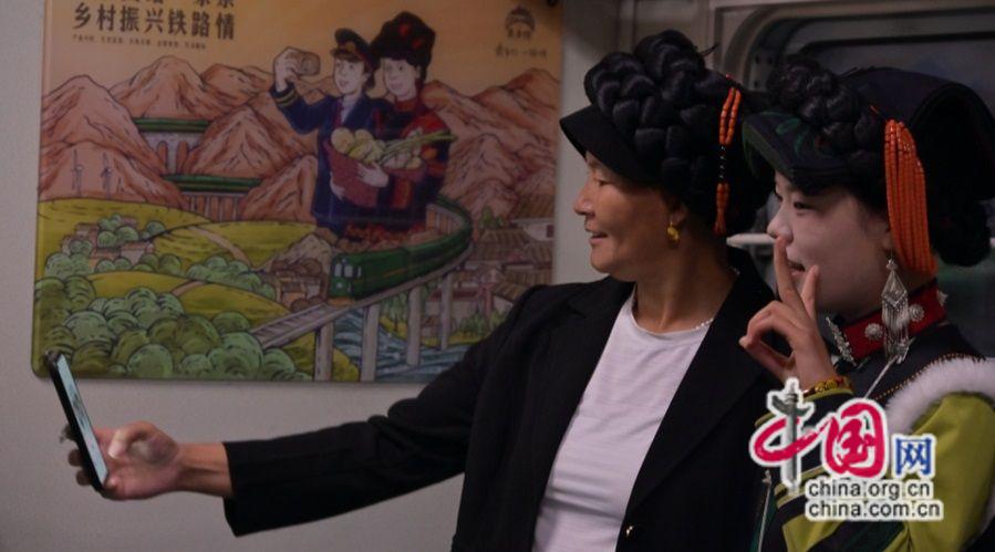 沿途,每當列車??吭谲囌镜却臅r間,彝族老鄉(xiāng)在鐵路工作人員的協(xié)同配合下搬起水果,牽起牛羊,抱起雞鴨放進一節(jié)節(jié)行李車廂上,慢火車的貨架上擺滿了農(nóng)產(chǎn)品。車廂里,人們互相交談,圍坐在一起放聲歌唱,好不熱鬧,歡樂的聲音從車廂內(nèi)傳出,像是在向廣袤的山川大地宣告著彝歷新年的盛事。