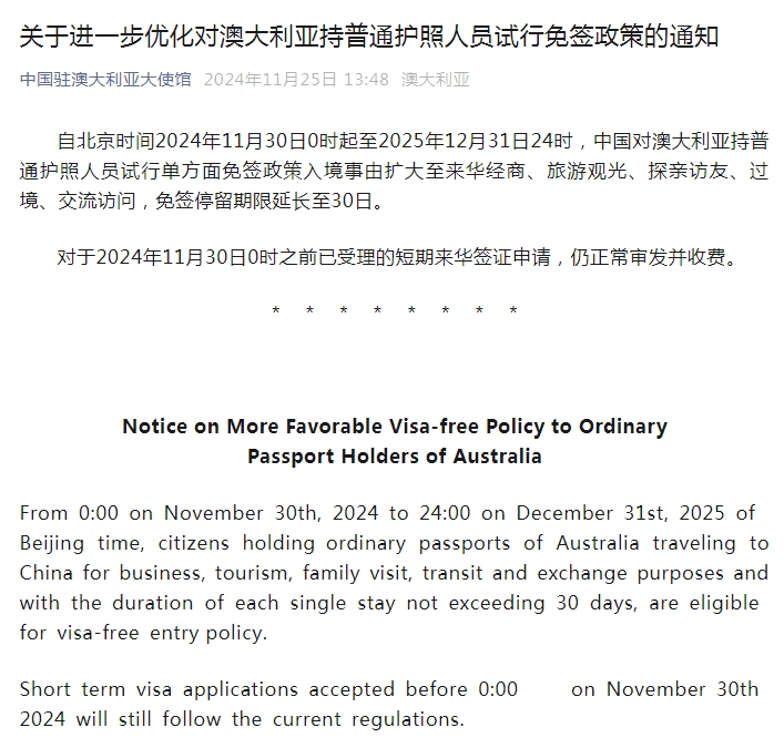 據(jù)“中國駐澳大利亞大使館”微信公眾號消息,自北京時(shí)間2024年11月30日0時(shí)起至2025年12月31日24時(shí),中國對澳大利亞持普通護(hù)照人員試行單方面免簽政策入境事由擴(kuò)大至來華經(jīng)商、旅游觀光、探親訪友、過境、交流訪問,免簽停留期限延長至30日。