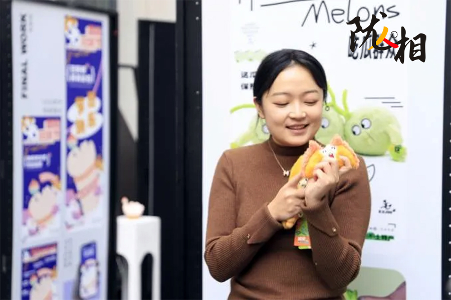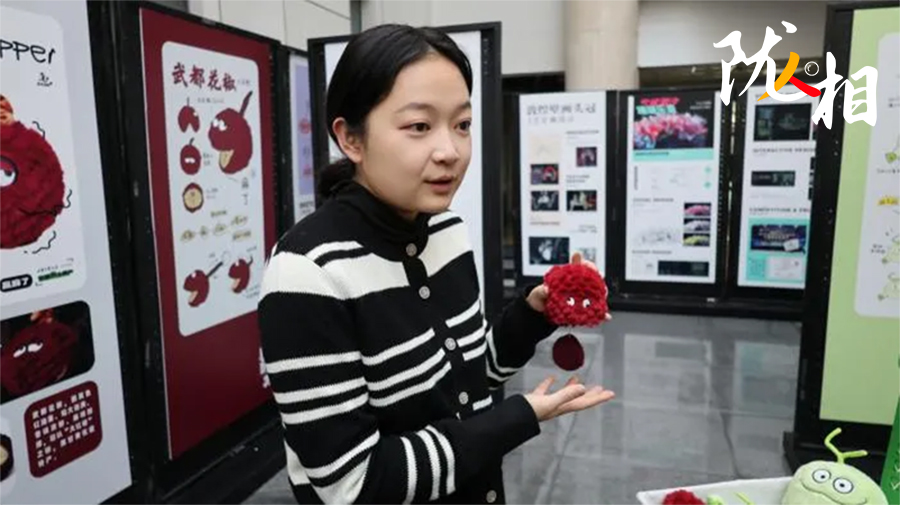 她拿起一只文創(chuàng)玩偶,輕輕拉起玩偶頂部蜷縮的細柄,這只紫紅色、毛茸茸的花椒玩偶立刻“嗡嗡”震動起來。花椒味覺上的麻就這樣傳遞到手上,精妙的構(gòu)思,令大家會心一笑。