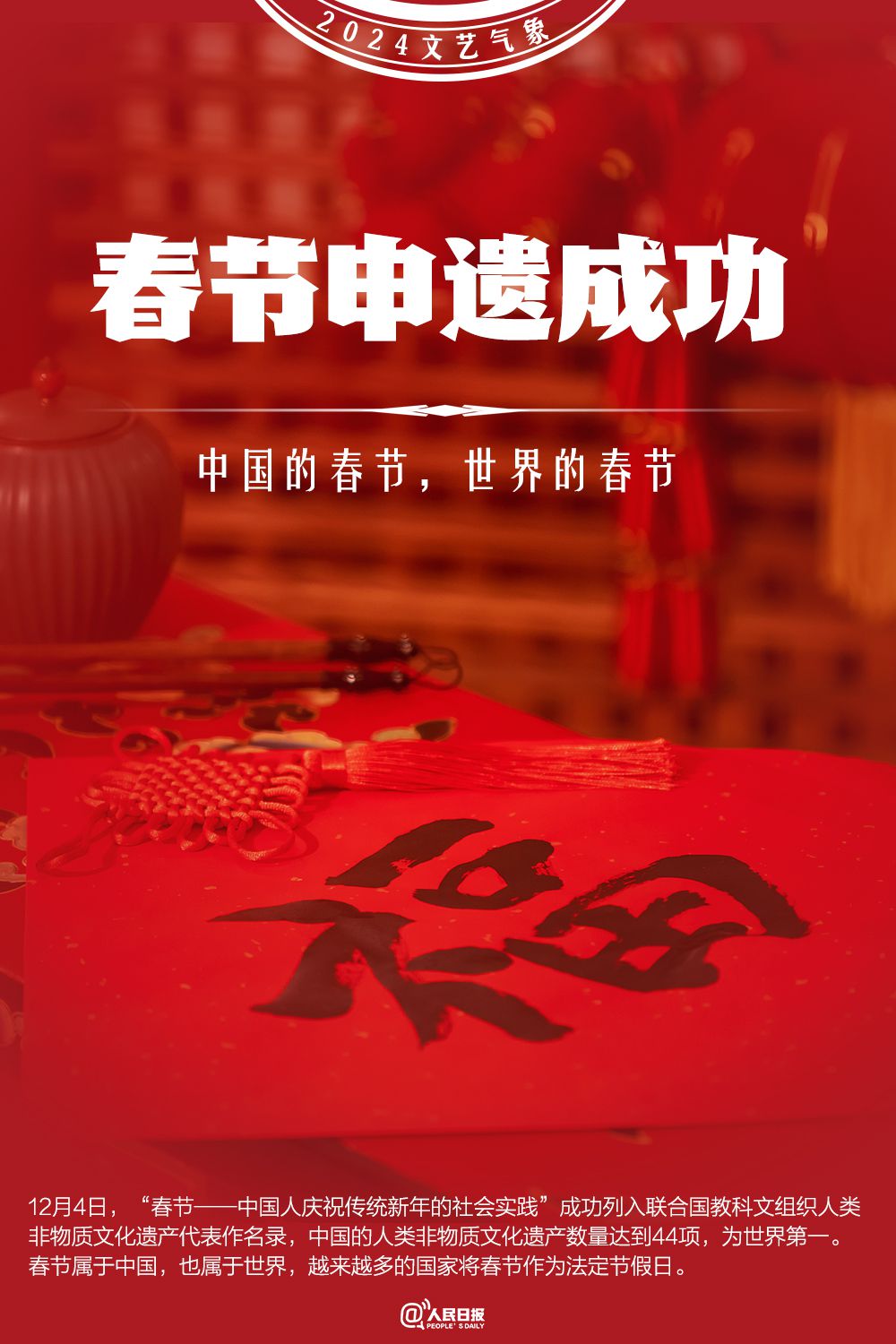 2024年7月27日,“北京中軸線——中國理想都城秩序的杰作”成功列入《世界遺產(chǎn)名錄》,中國世界遺產(chǎn)總數(shù)達(dá)到59項(xiàng)。12月4日,“春節(jié)——中國人慶祝傳統(tǒng)新年的社會(huì)實(shí)踐”成功列入聯(lián)合國教科文組織人類非物質(zhì)文化遺產(chǎn)代表作名錄,至此,中國共有44個(gè)項(xiàng)目列入聯(lián)合國教科文組織非物質(zhì)文化遺產(chǎn)名錄、名冊(cè),總數(shù)居世界第一。