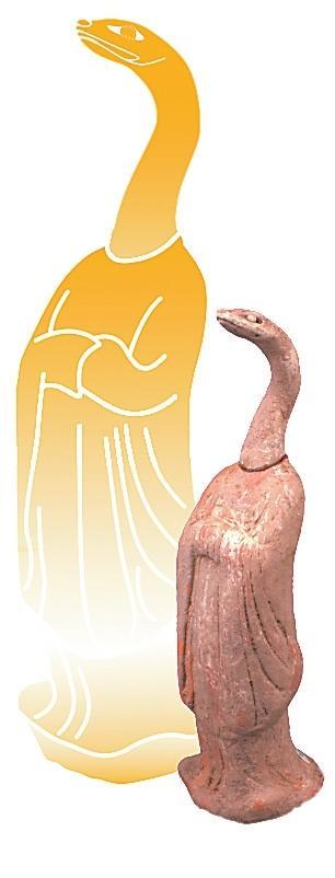 伏羲和女媧是中國(guó)神話傳說(shuō)中的創(chuàng)世神靈,被視為人類文明的始祖。相傳他們均為蛇身人首的形象,象征著自然與人類的和諧統(tǒng)一。伏羲被認(rèn)為是發(fā)明八卦、結(jié)繩記事的智者,開(kāi)啟了中華文明的智慧之門;而女媧則以其神力摶土造人,煉石補(bǔ)天,維護(hù)了天地的秩序。展覽中展出的高臺(tái)縣博物館館藏的一件魏晉時(shí)期的女媧圖彩繪壁畫磚。畫面繪女媧,人首蛇身,獸足,頭梳高髻,著交領(lǐng)紅裳,右手持月輪,月輪內(nèi)有蟾蜍,左手持規(guī),周圍繪云氣。同時(shí),還展出了一件高臺(tái)縣博物館館藏魏晉時(shí)期的伏羲女媧畫像磚,左側(cè)女媧,一手持矩、一手拿陰物,人首、蛇身、獸足、挽高髻、著交領(lǐng)長(zhǎng)衣,腹部繪月輪;右側(cè)伏羲,右手持規(guī),左手持日,內(nèi)有一金烏,周圍云氣環(huán)生,意在天界暢游。兩磚拼合形成陰陽(yáng)交合圖,為墓葬中室頂部藻井彩繪圖像。畫像中人首蛇身的伏羲、女媧形象,濃縮著中國(guó)上古時(shí)代的蛇崇拜意識(shí)。我國(guó)古代有天圓地方之稱,伏羲執(zhí)規(guī)象征天,女媧執(zhí)矩象征地,反映了墓主人追隨升天的愿望,也期望其后代能夠繁衍生息。