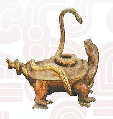 玄武是“四神”中的北方之神?!洞蟠鞫Y》:“龜上彎象天,下平法地。千載神龜,問(wèn)無(wú)不知,廣育無(wú)雄,以蛇為雄。故龜與蛇合謂玄武”。因此龜蛇形象的組合亦有陰陽(yáng)交接之意。除了瓦當(dāng)、畫像磚、雕塑外,古人還常將此二物繪于旗上,用于指揮軍隊(duì)、消災(zāi)避害之用。