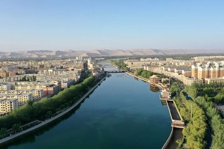 乘飛機從甘肅省會蘭州往西飛行約兩個小時后,茫茫戈壁上一個綠色小點出現(xiàn)在視線里。隨著飛機高度下降,俯瞰下去,一片多邊形的綠洲逐漸顯現(xiàn),如一塊美麗寶石。