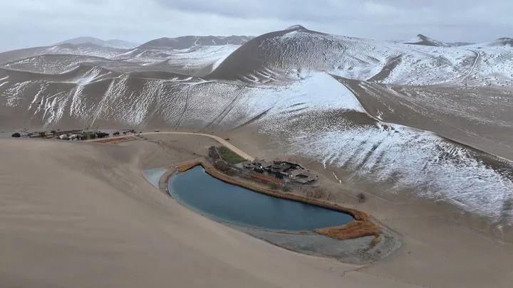 這是2014年11月23日拍攝的敦煌市鳴沙山月牙泉景區(qū)雪景(無人機照片)。新華社發(fā)(張曉亮攝)