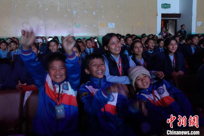 2月20日,中尼跨國新春文藝晚會在尼泊爾博克拉舉行,尼泊爾學生在聽到博克拉國際機場開通首條定期國際航線時歡呼雀躍?!≈行律缬浾?nbsp;崔楠 攝