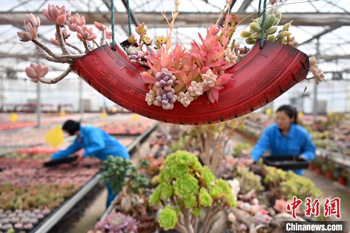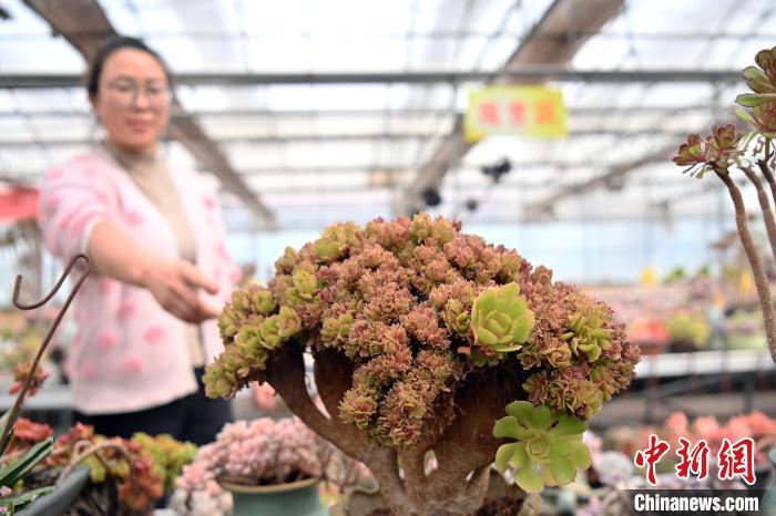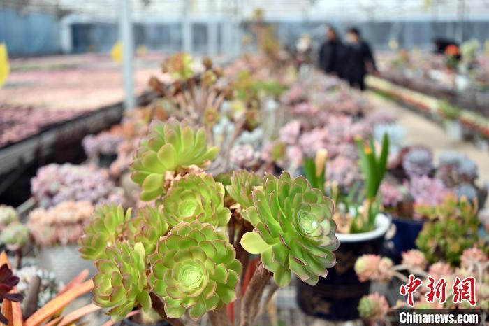 3月12日,在甘肅省蘭州市紅古區(qū)鑫源現(xiàn)代農業(yè)科技示范園種植大棚內種植的多肉植物。中新社記者 九美旦增 攝