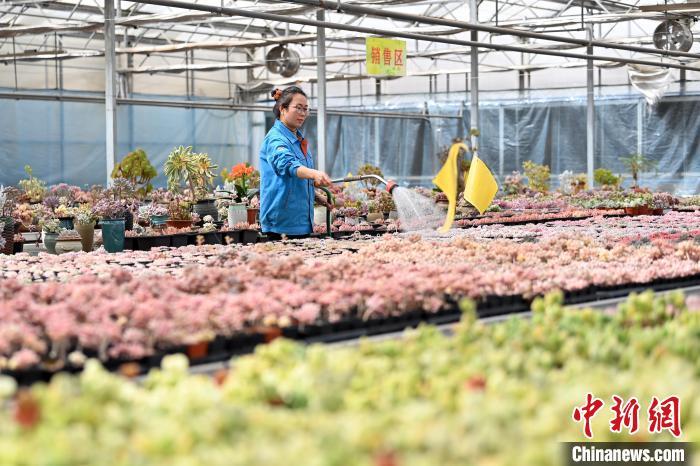 3月12日,在甘肅省蘭州市紅古區(qū)鑫源現(xiàn)代農業(yè)科技示范園種植大棚內,工作人員正在管護多肉植物。中新社記者 九美旦增 攝