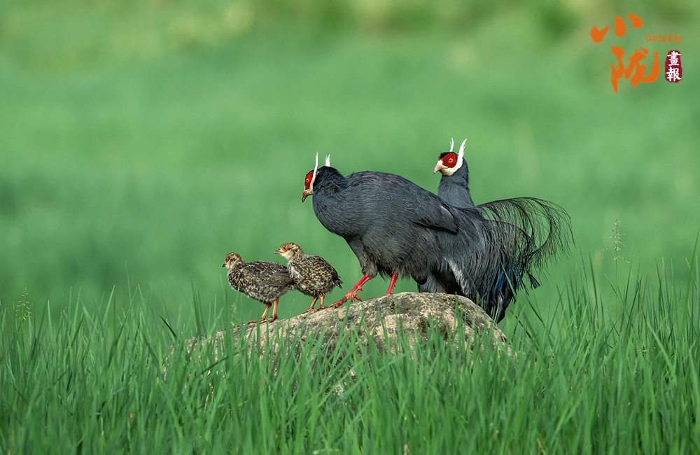 珍貴稀有的國家二級重點(diǎn)保護(hù)動物藍(lán)馬雞,體型較大,通體藍(lán)灰色,頸項和肩部顏色更深,閃爍著金屬般的輝亮。其尾羽特別長,由灰藍(lán)色漸變?yōu)榘底纤{(lán)色,并渲染著金屬綠和金屬紫藍(lán)色,24枚尾羽中,中央一對尾羽特別長,富有彈性,彎曲成一個美麗的弧形,高高地翹在其他尾羽之上,披散下垂如馬尾,因而得名。此外,藍(lán)馬雞的頭側(cè)緋紅,耳羽簇白色并突出于頸部頂上,為其增添了獨(dú)特的魅力。