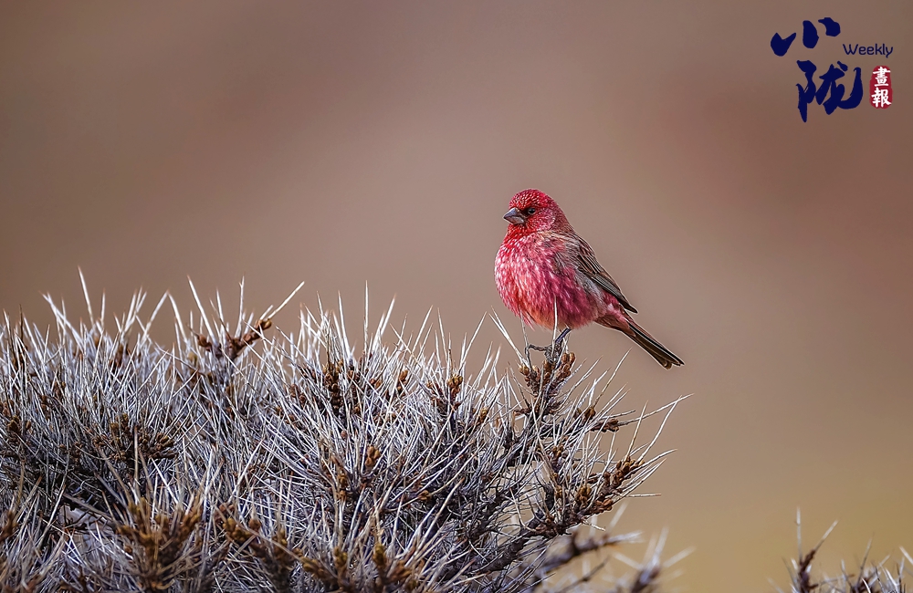 紅眉朱雀,是雀形目燕雀科朱雀屬的鳥類,中等體型,體長約為15厘米。雄鳥的特征是眉紋和臉頰呈淡紫粉色,而上體則有褐色斑駁。雌鳥沒有粉色,難稱“漂亮”,它們?nèi)砘液稚?ldquo;朱”一點(diǎn)也不沾邊兒,實際上,很多鳥類的雌鳥都要比雄鳥暗淡很多,這種暗淡的顏色能幫助它們在孵卵的時候更好地隱蔽,以逃過天敵的捕殺。雄鳥和雌鳥都類似于體型較小的曙紅朱雀。