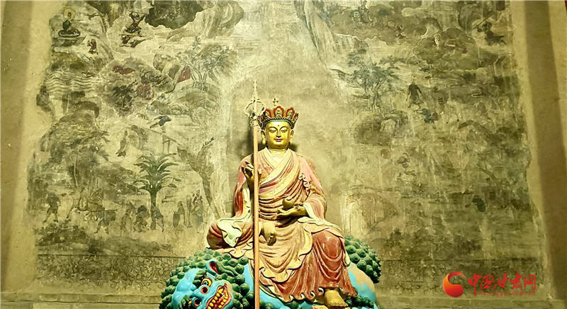這幅壁畫(huà)繪于大佛殿內(nèi)大佛身后墻壁,色彩雖已斑駁,卻仍難掩其藝術(shù)價(jià)值,是大佛殿內(nèi)時(shí)代較早、藝術(shù)水準(zhǔn)極高的作品。它距地面高1.55米,上下兩端用墨線(xiàn)勾出邊欄,邊欄內(nèi)繪纏枝牡丹點(diǎn)綴;《西游記》故事圖居于正中,殘長(zhǎng)約4.4米,殘高約2.9米,面積約12.7平方米,壁畫(huà)前今塑有地藏王菩薩像一尊。壁畫(huà)由“取水子母河”“道昧放心猿”“大戰(zhàn)紅孩兒”等多個(gè)獨(dú)立故事組成,畫(huà)面里險(xiǎn)山怪石、古木溪水、云霧火海錯(cuò)落交織,而師徒四人的分工設(shè)定始終清晰:豬八戒挑行李、沙僧牽馬、孫悟空持金箍棒護(hù)送,這份“固定分工”讓豬八戒的勤勞形象貫穿全程。