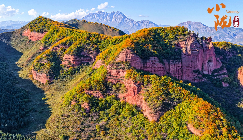 俯瞰整個冶力關,遠處的雪峰在陽光照耀下泛著銀光,與近處的彩林形成鮮明對比,宛如一幅氣勢磅礴的山水畫卷。
